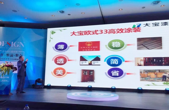 涂料作為木器產業鏈的下游產業,與家具行業有著天然的聯系。作為青木大講堂戰略合作伙伴、木制品涂裝工藝顧問,大寶漆不負所望,為大會帶去了“大寶漆定制家具涂裝解決方案”即大寶歐式涂裝三三專案。黃文敏高專從大寶漆的特點與優勢入手,突出了歐式涂裝所具備的“薄、透、美、穩、簡、省”等特點。