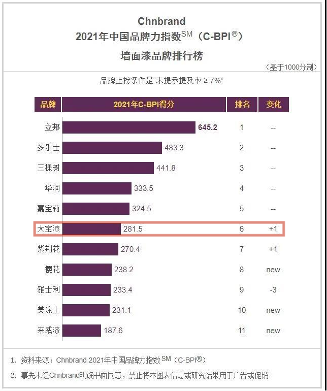 4月20日,國內品牌評級權威機構Chnbrand發布2021年(第十一屆)中國品牌力指數SM(C-BPI®)品牌排名和分析報告,大寶漆再次入榜。