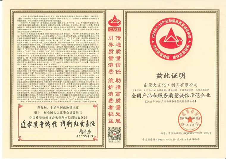 榮譽,是對大寶漆的肯定,更是推動大寶漆不斷向前發(fā)展的動力!未來,大寶漆仍將不忘初心,始終專注于高品質(zhì)涂料的研發(fā)推廣,積極恪守質(zhì)量誠信,踐行社會責任,以微薄之力助推國家“質(zhì)量強國”建設。