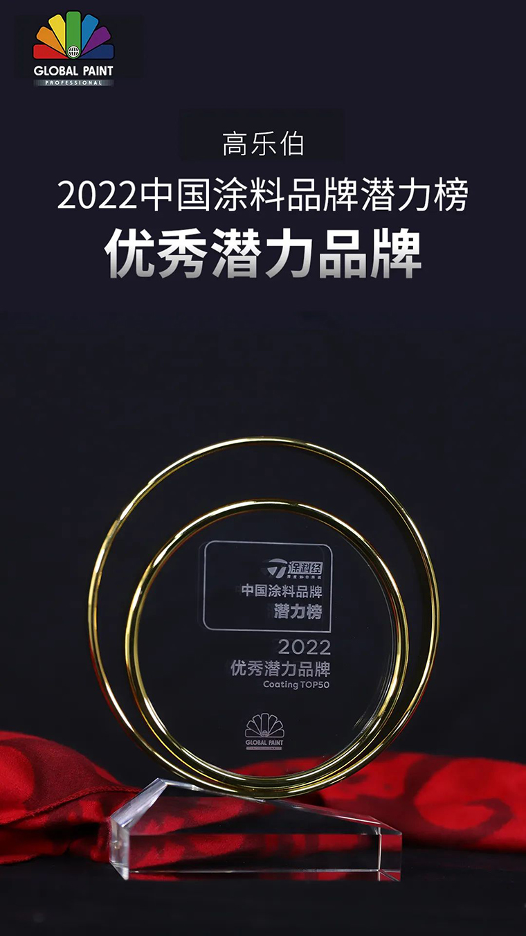 歷經層層評審,高樂伯憑借著過硬的品牌實力和優秀的產品質量,從眾多涂料品牌中脫穎而出,被評為“2022優秀潛力品牌”!