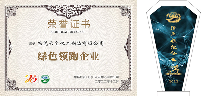 東莞大寶化工制品有限公司榮獲由中環(huán)聯(lián)合認證中心授予的“綠色領跑企業(yè)”榮譽稱號,這是對東莞大寶化工30年來不斷在綠色環(huán)保方面追求卓越的最好嘉許。