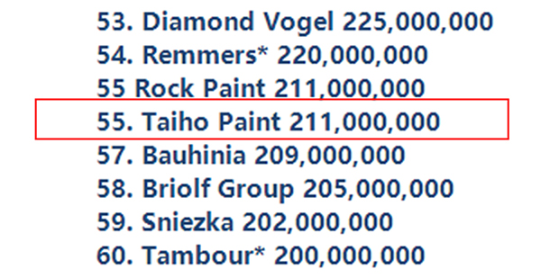 近日,美國《涂料世界》(Coatings World)雜志發布了2023年全球頂級涂料企業排行榜,全球73家涂料企業上榜,作為民族涂料品牌,大寶漆連續多年登上該排行榜,位列第55名。