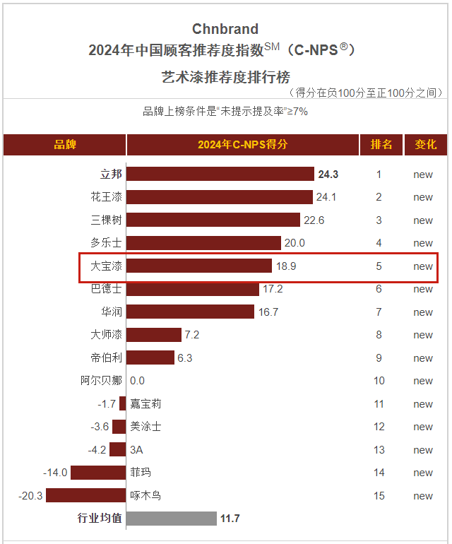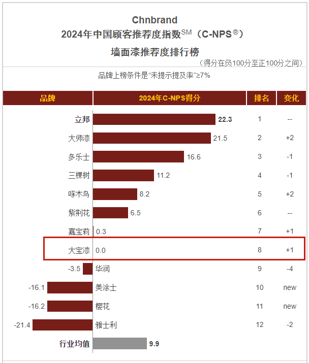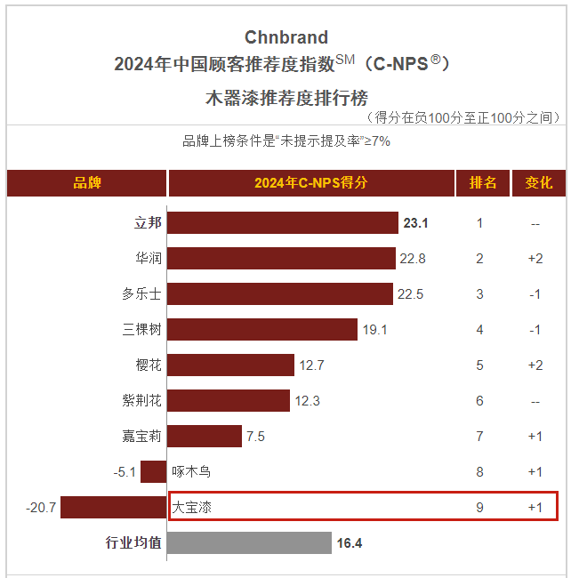 1月,品牌評(píng)級(jí)權(quán)威機(jī)構(gòu)Chnbrand發(fā)布2024年(第十屆)中國(guó)顧客推薦度指數(shù)(C-NPS)品牌排名和分析報(bào)告。大寶墻面漆、木器漆、藝術(shù)漆分別以優(yōu)異的口碑入圍排行榜單。
