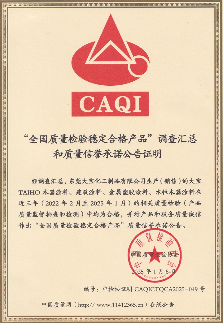 值此國際消費者權益日之際(2025年3月15日),中國質量檢驗協會隆重舉辦"產品和服務質量誠信承諾"主題活動。大寶漆憑借卓越的產品品質與優質的服務體驗,在本次評選中一舉斬獲"全國產品和服務質量誠信承諾企業"和"全國質量檢驗穩定合格產品"兩項殊榮。