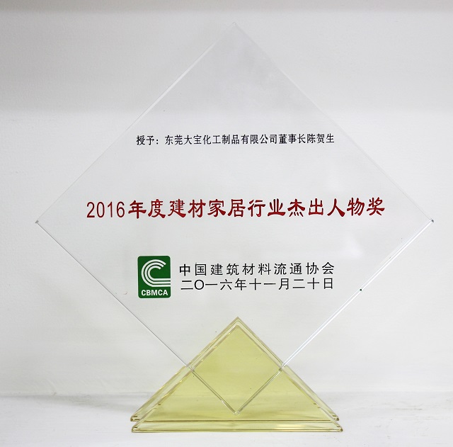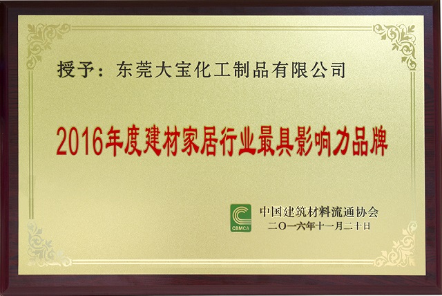 鑒于在二十多年的發(fā)展中所取得的成績,以及對中國建材家居所做的貢獻,東莞大寶化工被授予“2016年度建材家居行業(yè)最具影響力品牌”獎,同時大寶國際董事長陳賀生獲“2016年度建材家居行業(yè)杰出人物”獎。