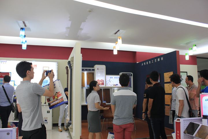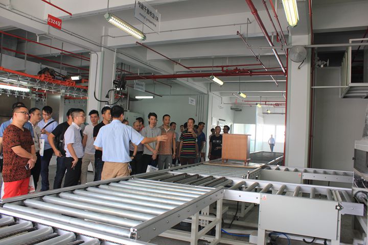 在大寶化工工作人員的陪同下,青家協一行先后參觀了中央實驗室、4C元素店、智能涂裝測試線、色板中心、后花園和安管中心。在色板中心參觀時,家具企業家們紛紛慨嘆大寶漆精湛的施工工藝和優越的品質,表示對大寶漆早有耳聞,今日一見,更是加強了與大寶漆合作的意念。