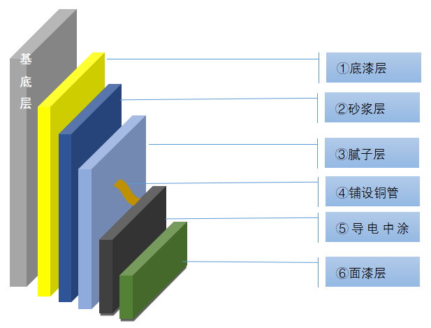 橫、縱向間隔4m(或按設(shè)計(jì)要求)鋪設(shè)銅箔(銅箔上用EPD-401A/B封閉一遍) |